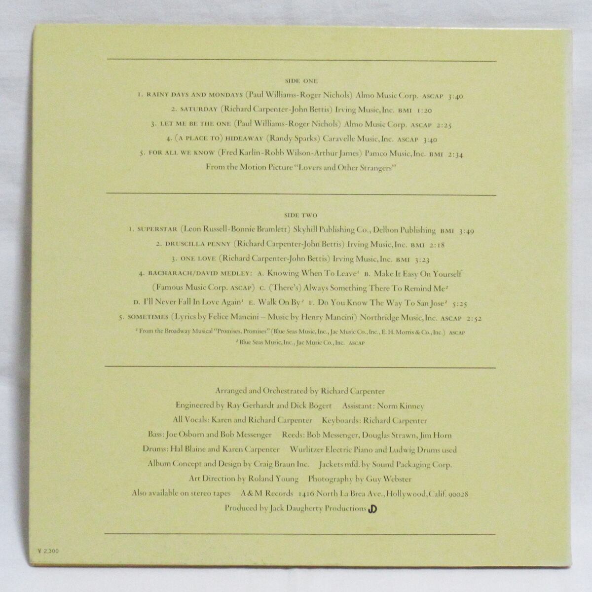1971年にリリースされたカーペンターズの3rdアルバム。英タイトルは原点回帰ともいえるグループ名タイトルで、邦題は発売当時「ふたりの誓い」でしたが、収録曲”スーパースター”が大ヒットとなり、途中で帯のみ「スーパースター~」に変わりました。