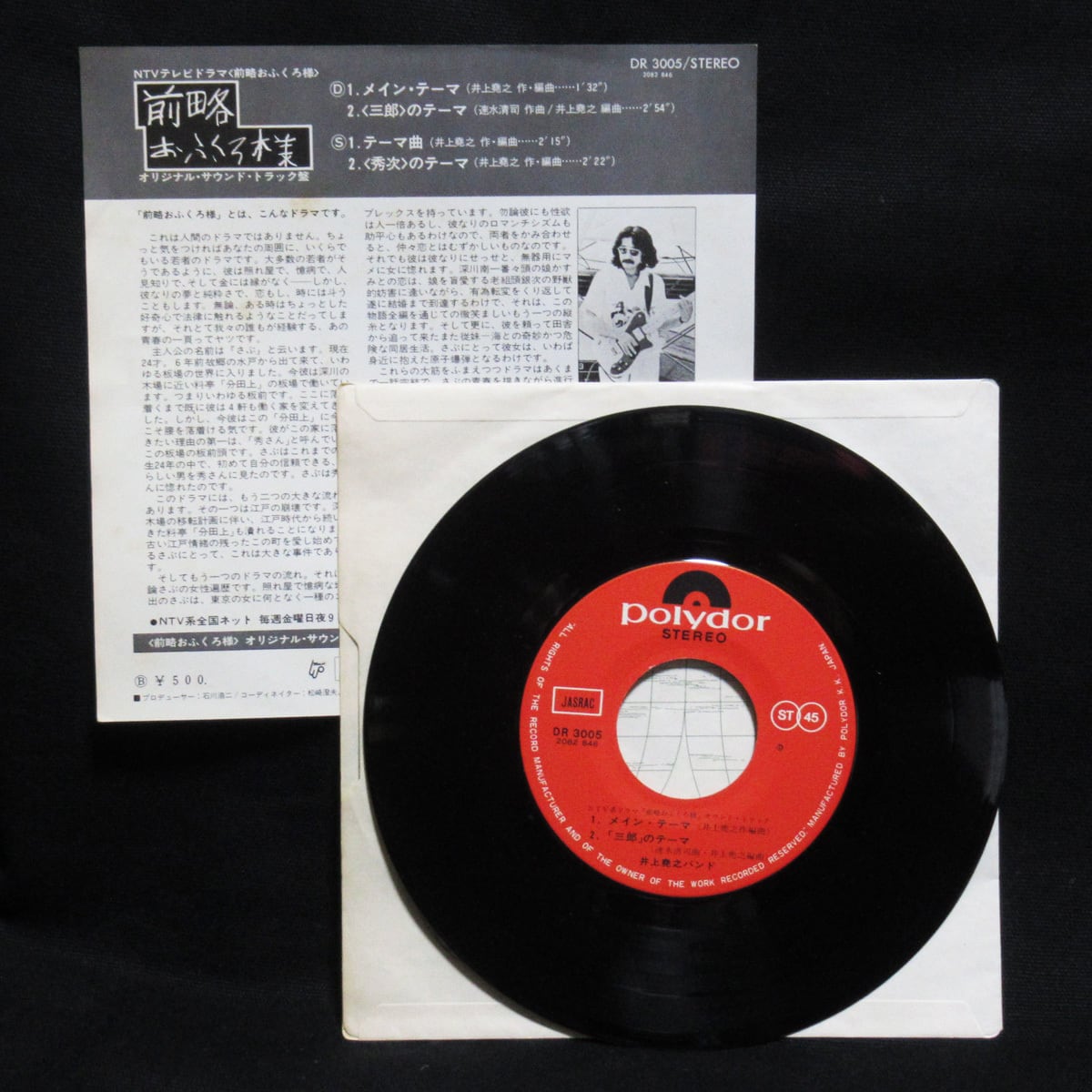 ショーケン主演のドラマ「前略おふくろ様」のサントラ盤。”メインテーマ”、”三郎のテーマ”、”テーマ曲”、”秀次のテーマ”の4曲入り。演奏が井上堯之バンドなら間違いありません!