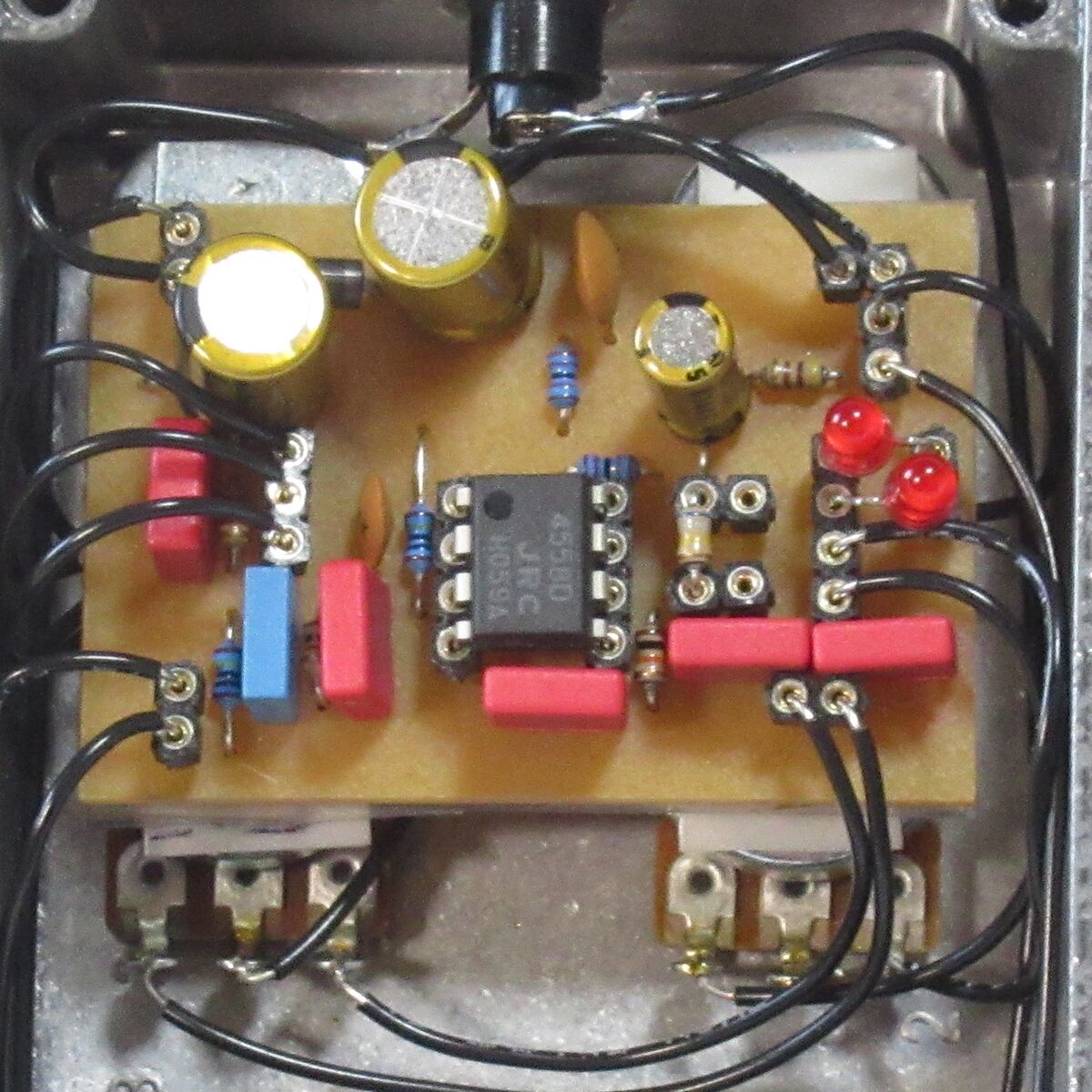 M社の「CRUNCH BOX」に影響を受け製作したディストーション。あらゆるジャンルに登場させることが可能!クリーンサウンドに加えるエフェクターにすることをオススメします。オペアンプはSYU氏が好きな4558Dを搭載。