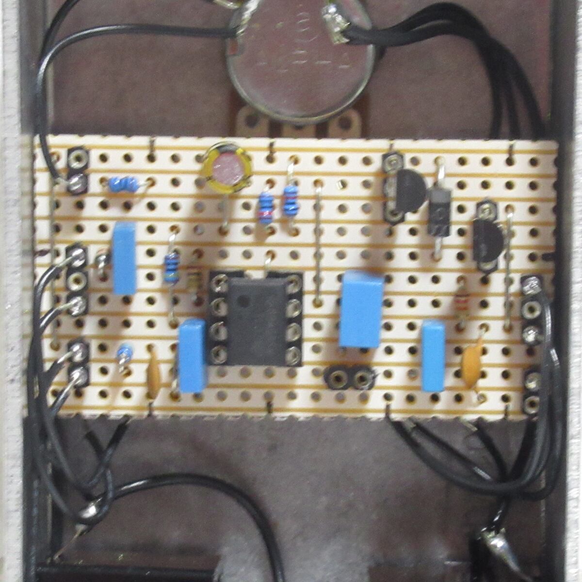 この回路はB社のDS-1、OCDを参考にしつつフルモディファイしています。シングル回路のオペアンプを使い、ダイレクト感を得たかったのでバッファーを排除しました。ハードクリッピングの素子にOCDで使われている2N7000、そして整流ダイオードによる非対称のクリッピングを得ています。ナローケースに入れたのは、音の締まりが欲しかったからです。